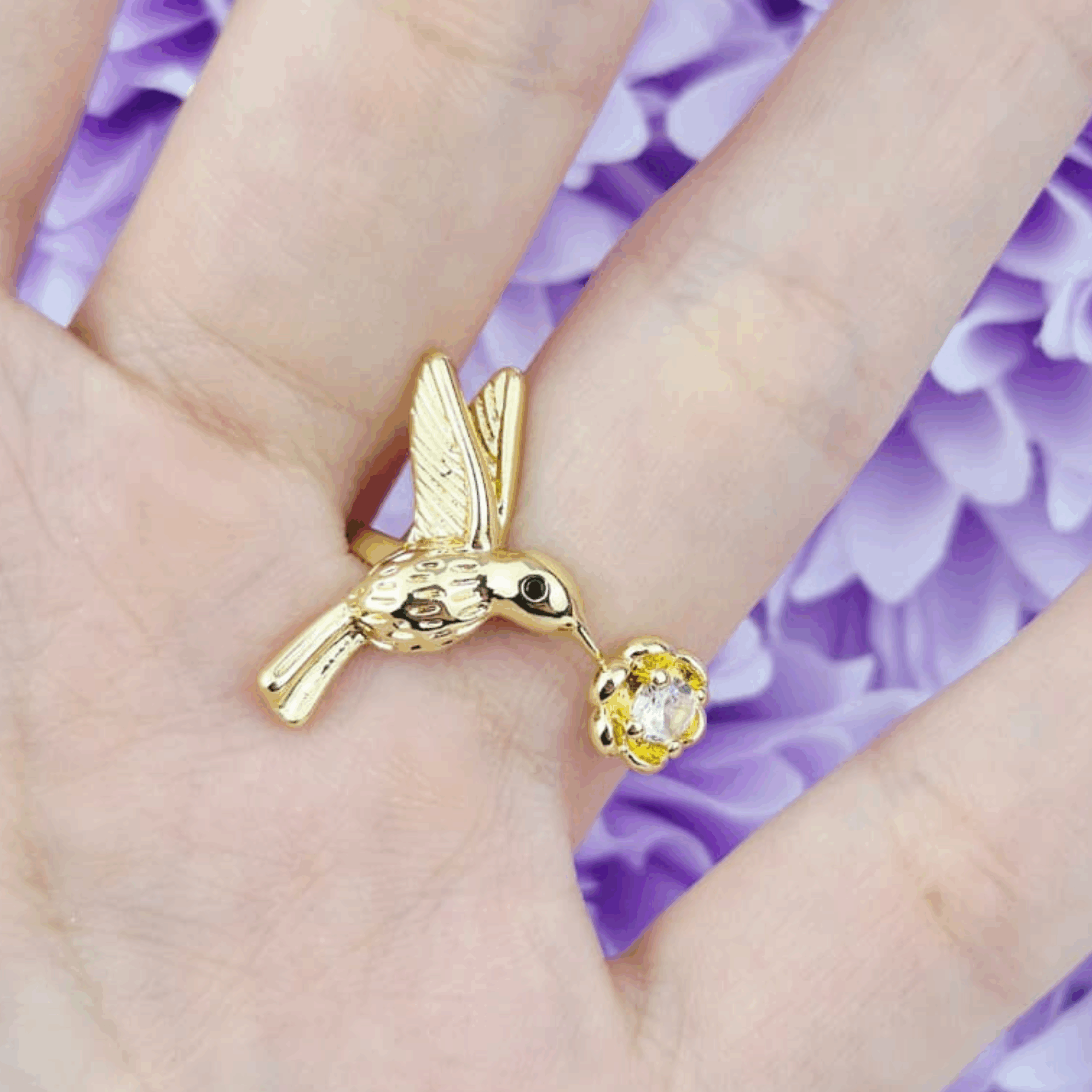 Anillo con un delicado diseño de colibrí sostenido sobre una flor con cristal brillante, una pieza que simboliza belleza, libertad y energía positiva. Los detalles del ave y el destello del cristal hacen que este anillo destaque por su encanto y originalidad.