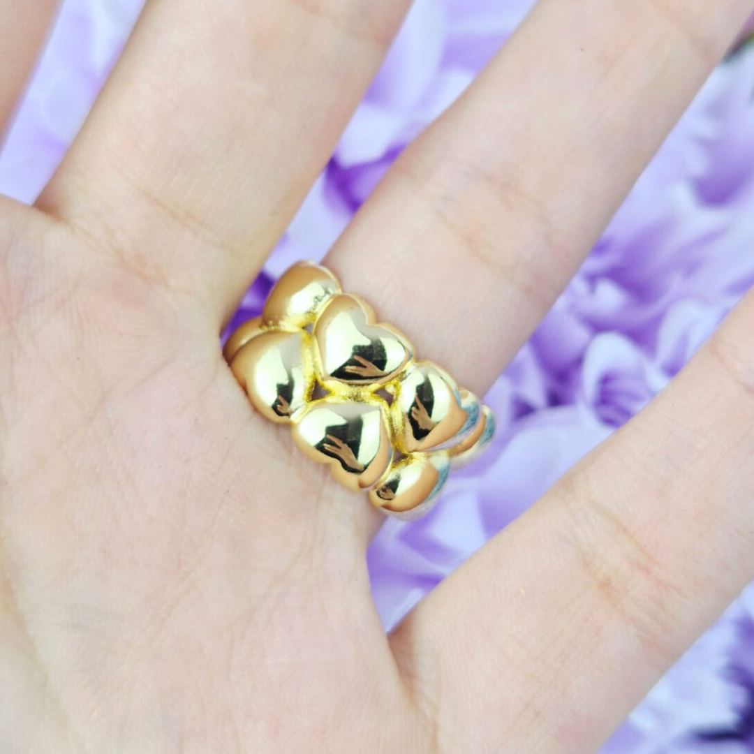 Anillo con diseño de doble hilera de corazones inflados, una pieza que combina ternura y estilo moderno. Su volumen y acabado brillante lo convierten en un accesorio llamativo y romántico, perfecto para quienes aman los detalles con significado y presencia.