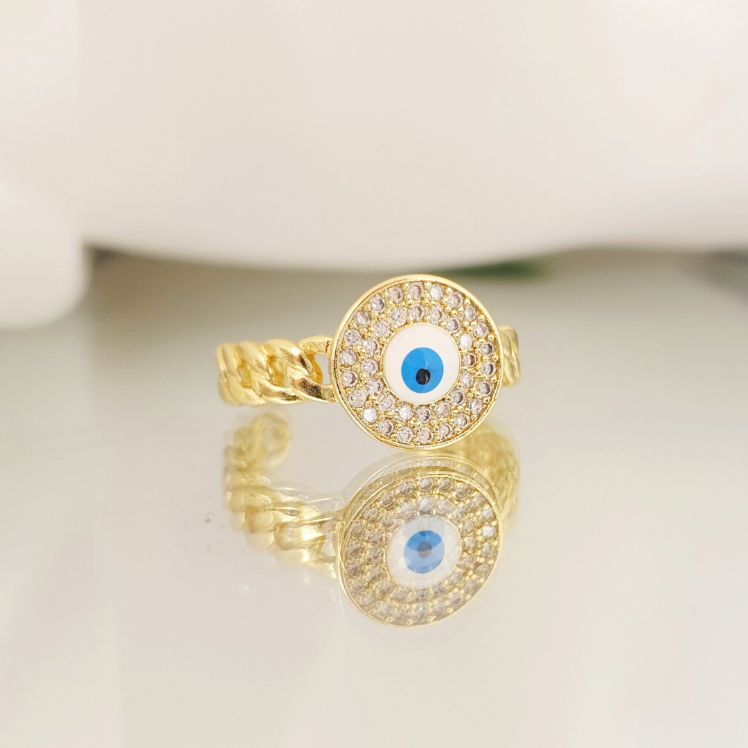 Anillo con diseño central de ojo esmaltado en azul, rodeado por un doble círculo de zirconias que aportan brillo y equilibrio visual. Su banda tipo cadena combina fuerza y elegancia, convirtiéndolo en una pieza moderna y simbólica, perfecta para quienes buscan protección y estilo en un solo accesorio.