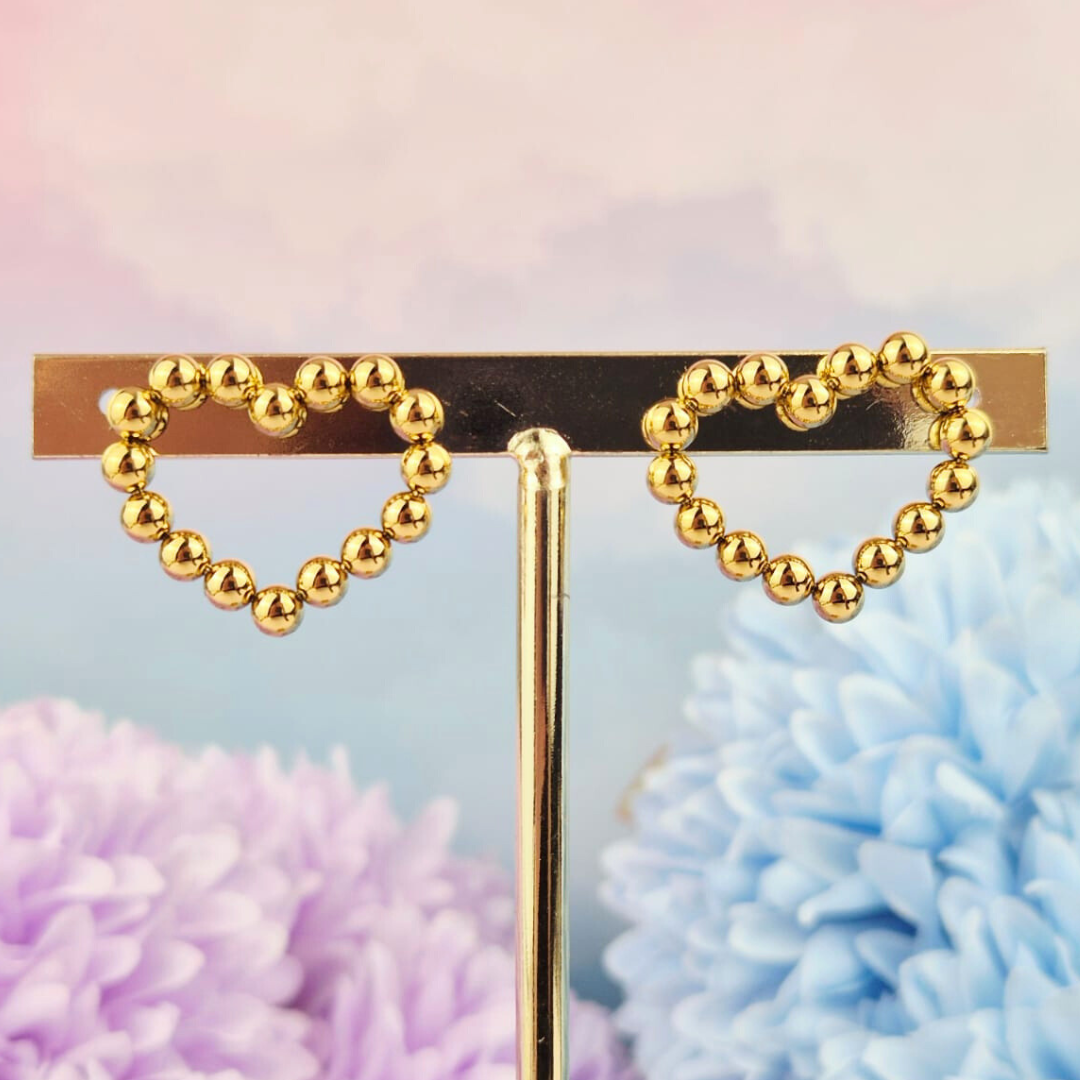 Aretes con forma de corazón formados por pequeñas esferas lisas que crean un diseño moderno y delicado. Su estructura abierta y simétrica aporta un toque romántico y contemporáneo, ideal para quienes buscan accesorios con encanto y estilo.