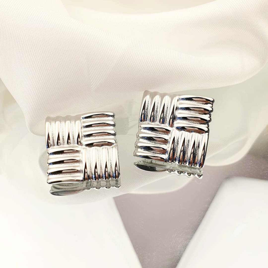 Aretes tipo maxi con diseño cuadrado dividido en cuatro secciones con textura tipo tejido metálico. Su relieve geométrico y acabado brillante crean un efecto visual moderno y elegante, ideal para quienes buscan accesorios con presencia y estilo contemporáneo.
