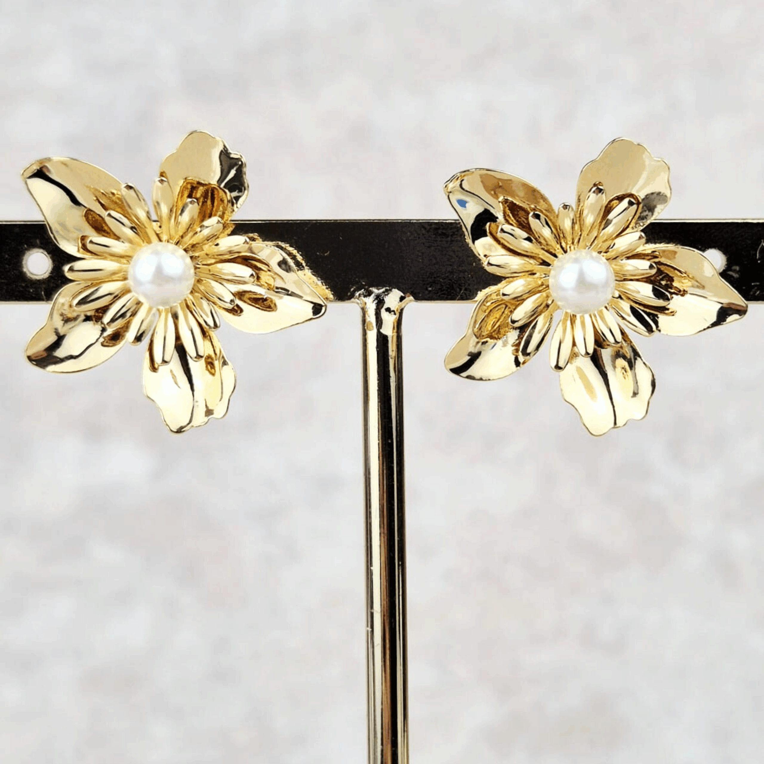 Estos aretes en forma de flor cuentan con pétalos dorados de acabado brillante y textura delicada, rematados con una perla central que aporta un estilo clásico y sofisticado. Fabricados en chapa de oro, son ligeros y cómodos de llevar, ideales para looks femeninos y chic.
