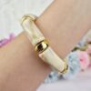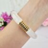 Pulso elaborado en acrílico tono blanco con efecto marmoleado y diseño tubular. Cuenta con cinco barras acrílicas y siete separadores delgados dorados estilo plastimetal. Una pieza moderna, elegante y luminosa que combina neutralidad y brillo dorado para elevar cualquier look.