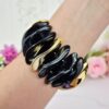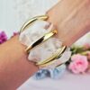 Este brazalete destaca por su diseño moderno y elegante de acrílico en tono verde musgo y separadores metálicos tubulares dorados. Su combinación de color natural con acabado dorado lo convierte en una pieza versátil y sofisticada.