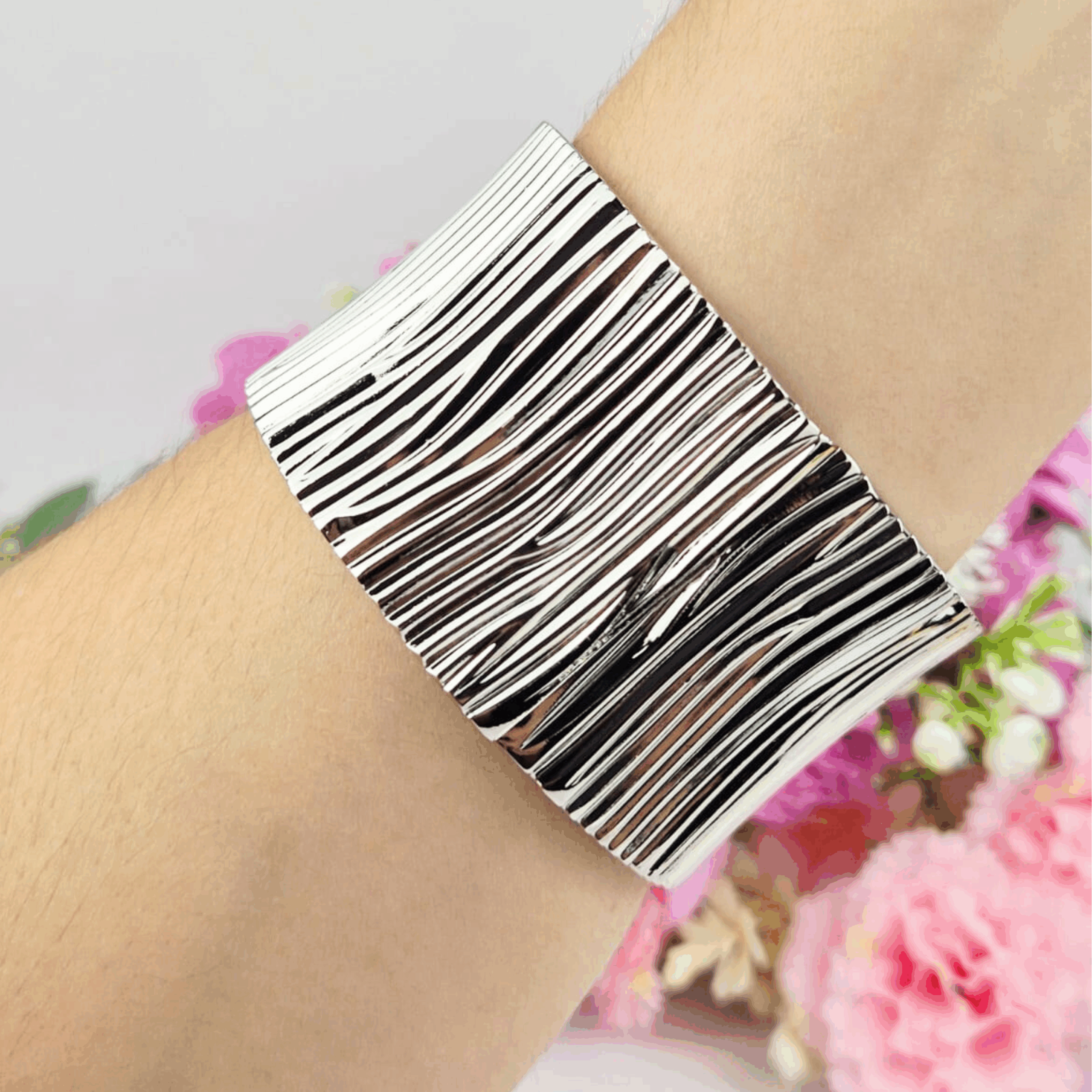 El Brazalete Circular Corrugado en Chapa de Oro Plateado es una pieza moderna y llamativa que destaca por su textura ondulada. Su diseño elegante y brillante aporta un toque contemporáneo a cualquier atuendo, convirtiéndolo en un accesorio ideal para quienes aman los detalles únicos y sofisticados.