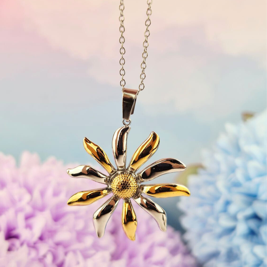 Collar con dije en forma de flor grande con pétalos bicolor dorado y plateado, una pieza que combina elegancia y alegría en un solo diseño. Su contraste metálico crea un efecto luminoso que resalta el movimiento natural de los pétalos, aportando frescura y sofisticación a cualquier look.