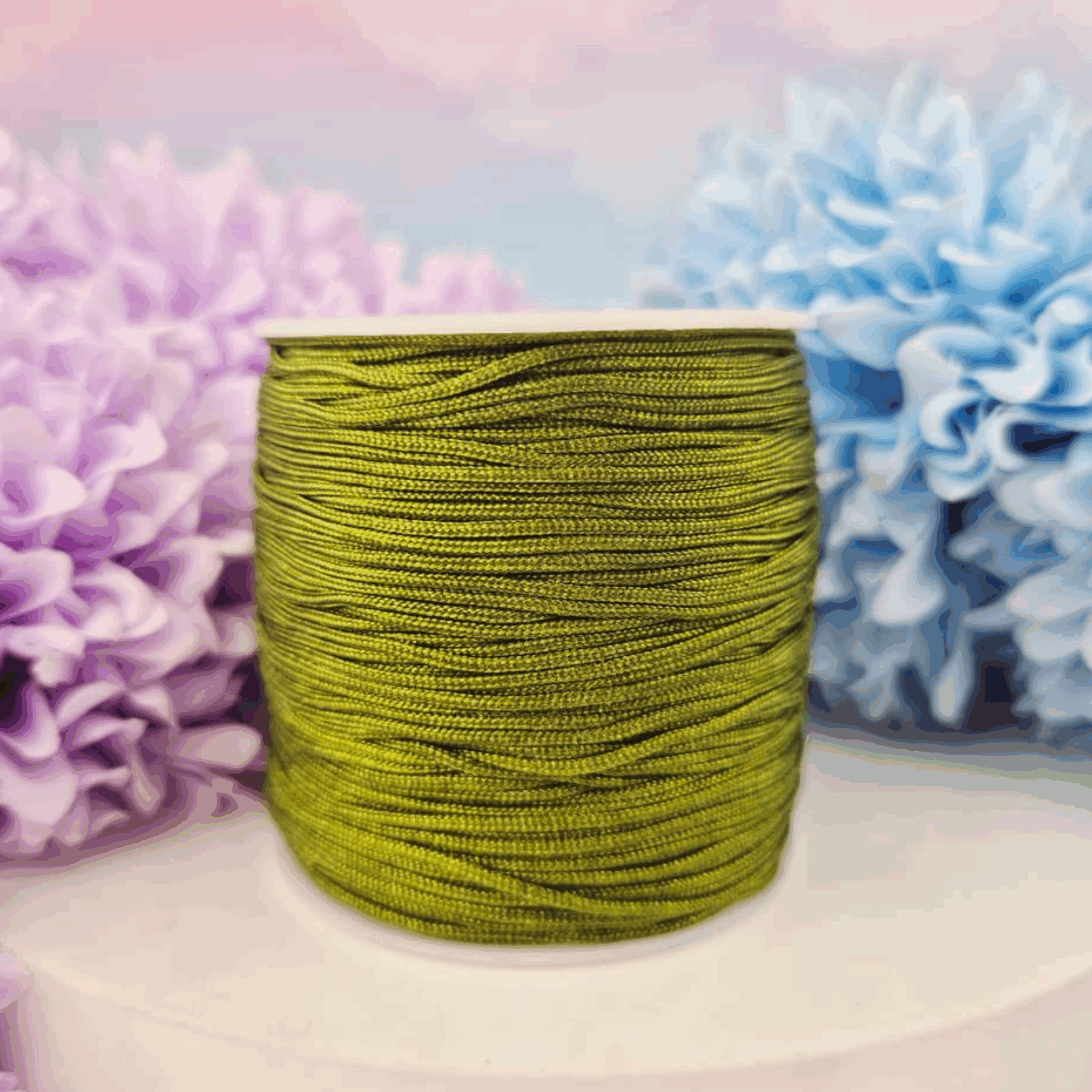 Hilo chino de 1 mm de grosor, 100 mts en tono verde olivo, ideal para crear pulseras tejidas, collares, anillos ajustables y proyectos artesanales. Su textura firme y ligeramente brillante facilita el anudado, permitiendo realizar diseños resistentes y de acabado profesional.