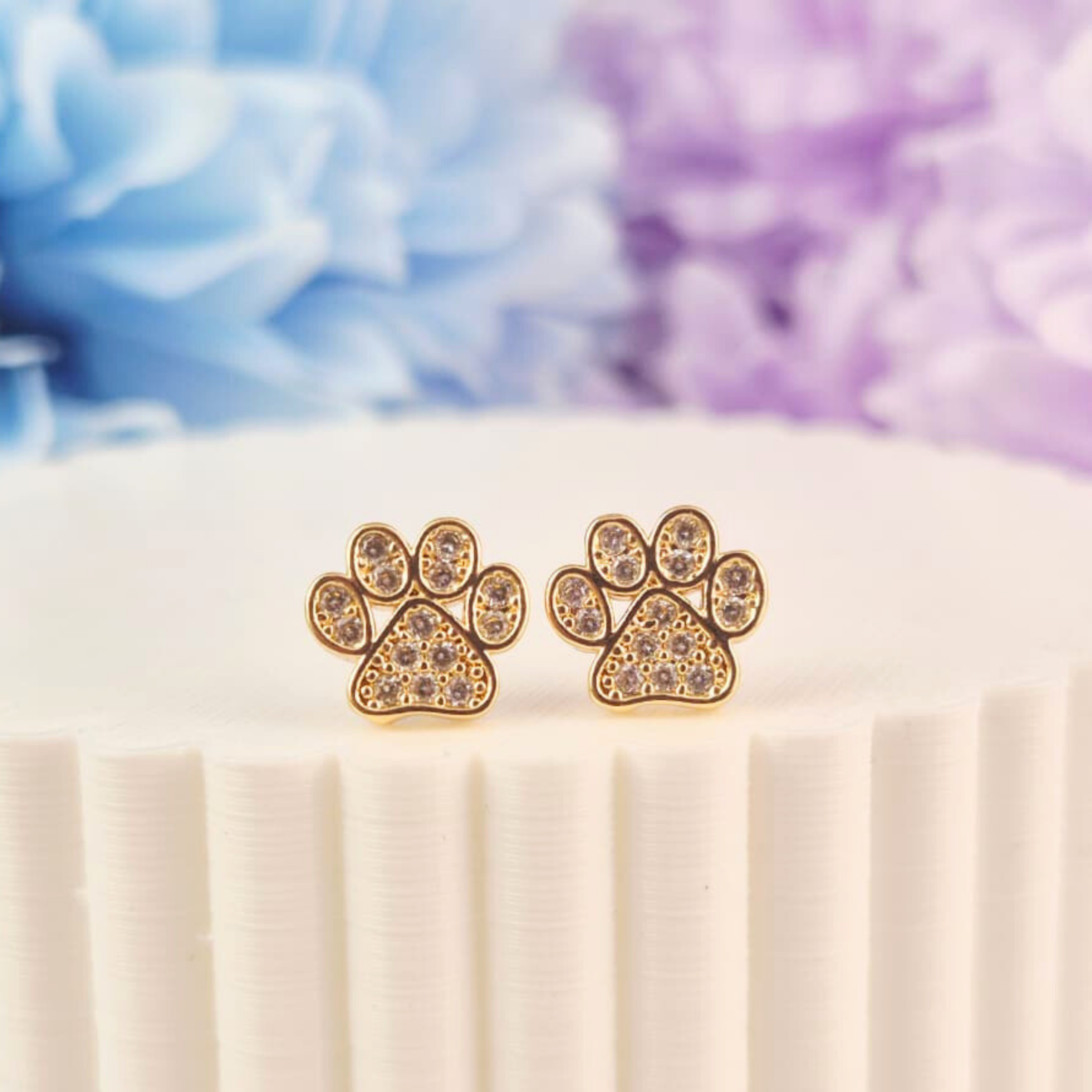 Aretes con encantador diseño de huella canina decorados con pequeños cristales brillantes que aportan un toque de luz y elegancia.