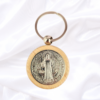 Llavero con medalla de San Benito, reconocido como un símbolo de protección, fe y fortaleza espiritual. Su diseño circular presenta la imagen tradicional del santo junto a los símbolos y oraciones que lo caracterizan, convirtiéndolo en un accesorio con profundo significado religioso.