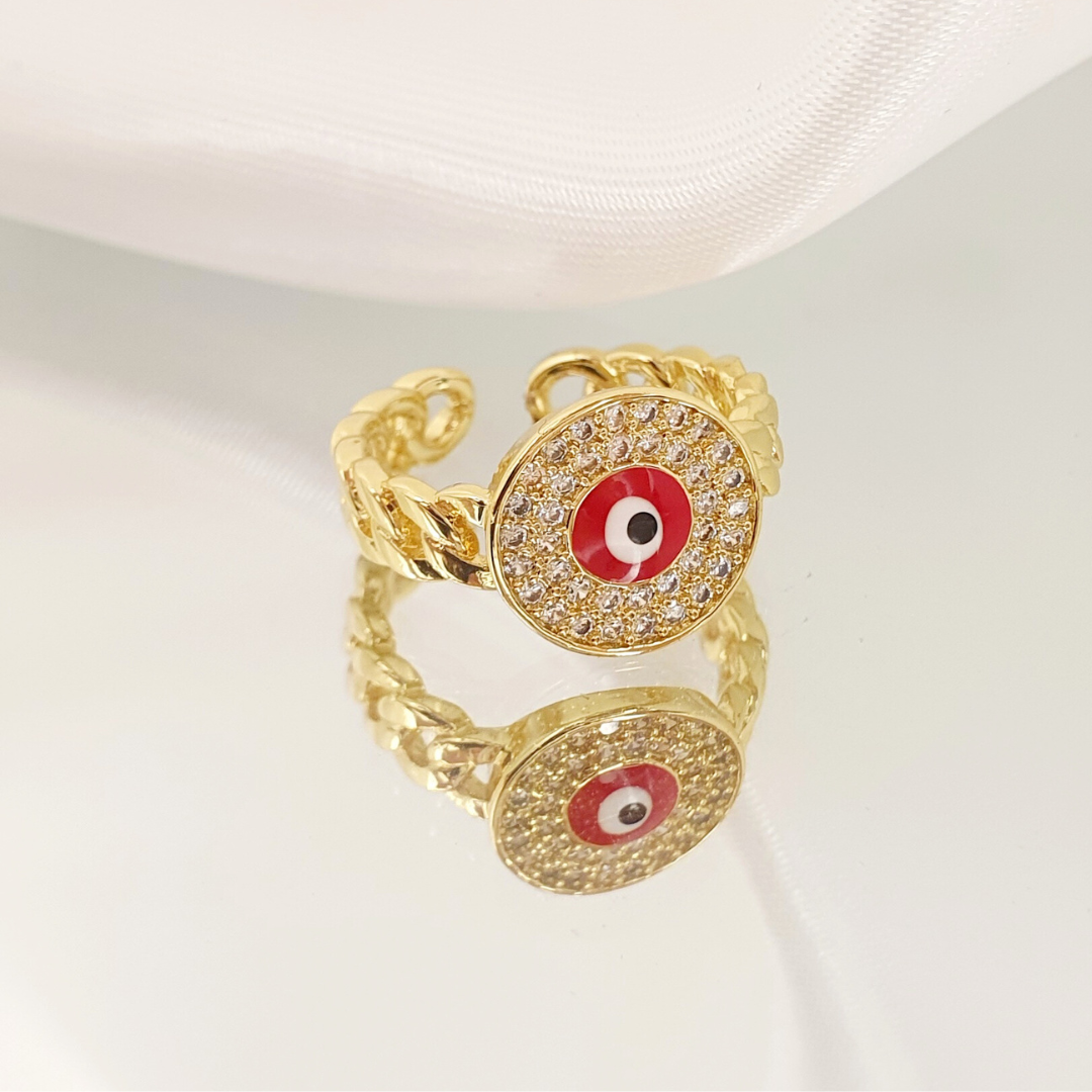 Anillo con diseño central de ojo esmaltado en rojo, rodeado por un doble círculo de zirconias que aportan brillo y equilibrio visual. Su banda tipo cadena combina fuerza y elegancia, convirtiéndolo en una pieza moderna y simbólica, perfecta para quienes buscan protección y estilo en un solo accesorio.