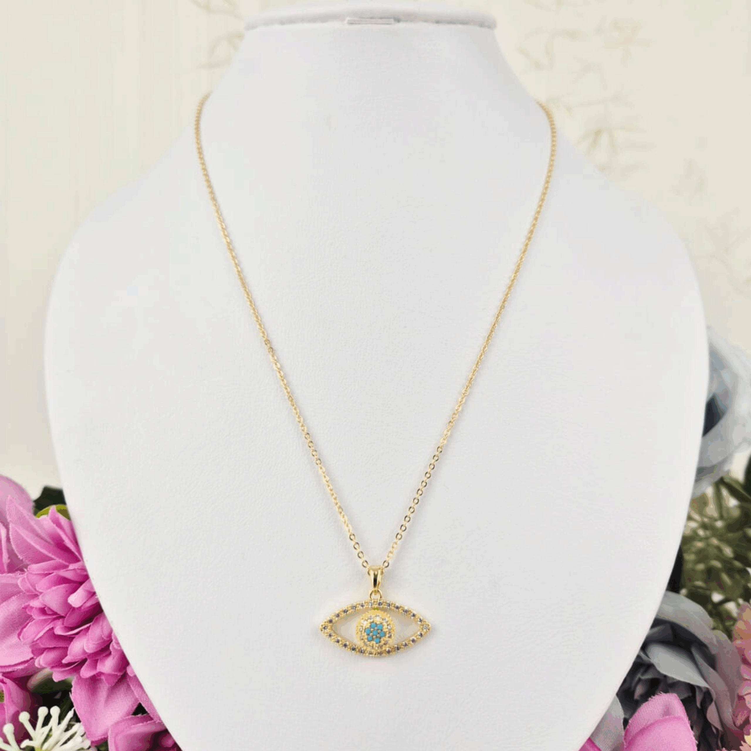 El Collar Ojo Alargado con Cristal Turquesa es un accesorio cargado de simbolismo y estilo. Su dije en forma de ojo, elaborado en acero inoxidable color dorado, presenta un diseño alargado y elegante con detalles de pequeños cristales que enmarcan un centro turquesa en forma de flor, evocando protección y buena energía.