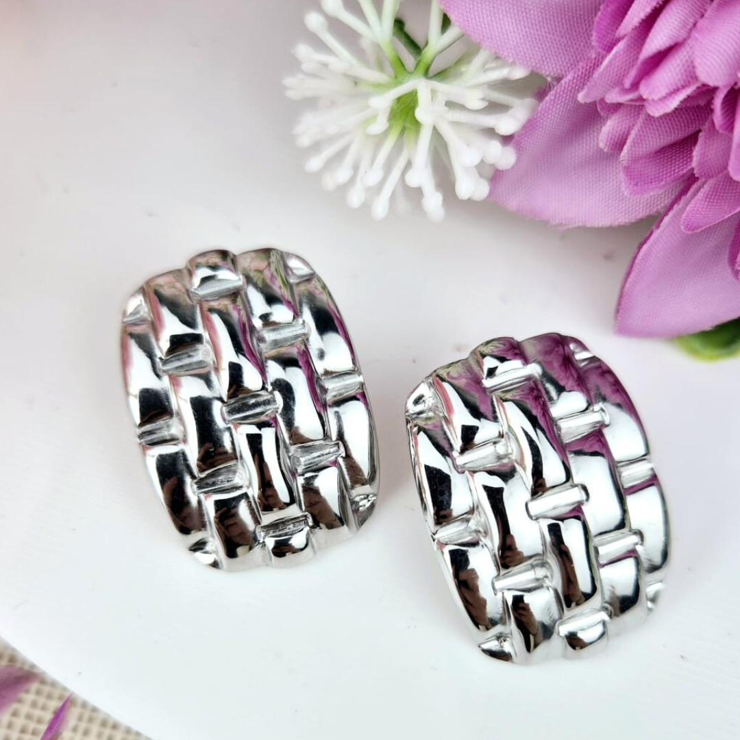 Aretes de diseño ovalado grande con textura tipo tejido metálico que combina estilo moderno y sofisticación. Su relieve entrelazado crea un efecto tridimensional elegante y contemporáneo, ideal para quienes buscan accesorios con carácter y presencia.