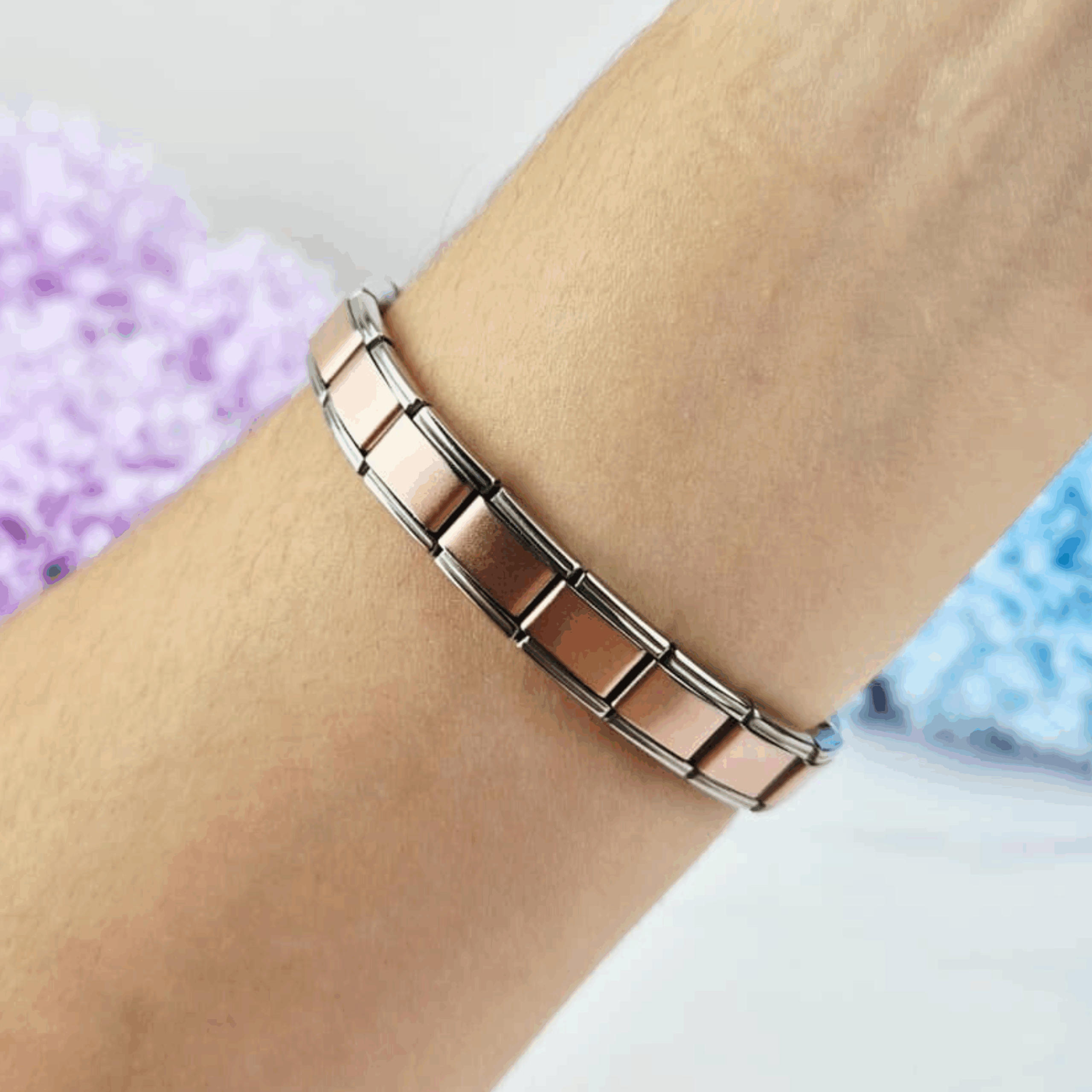 Pulsera italiana elástica de diseño bicolor con eslabones en acabado mate rosa y plateado. Fabricada en acero inoxidable, combina estilo moderno y delicadeza, creando un look femenino, elegante y sofisticado.