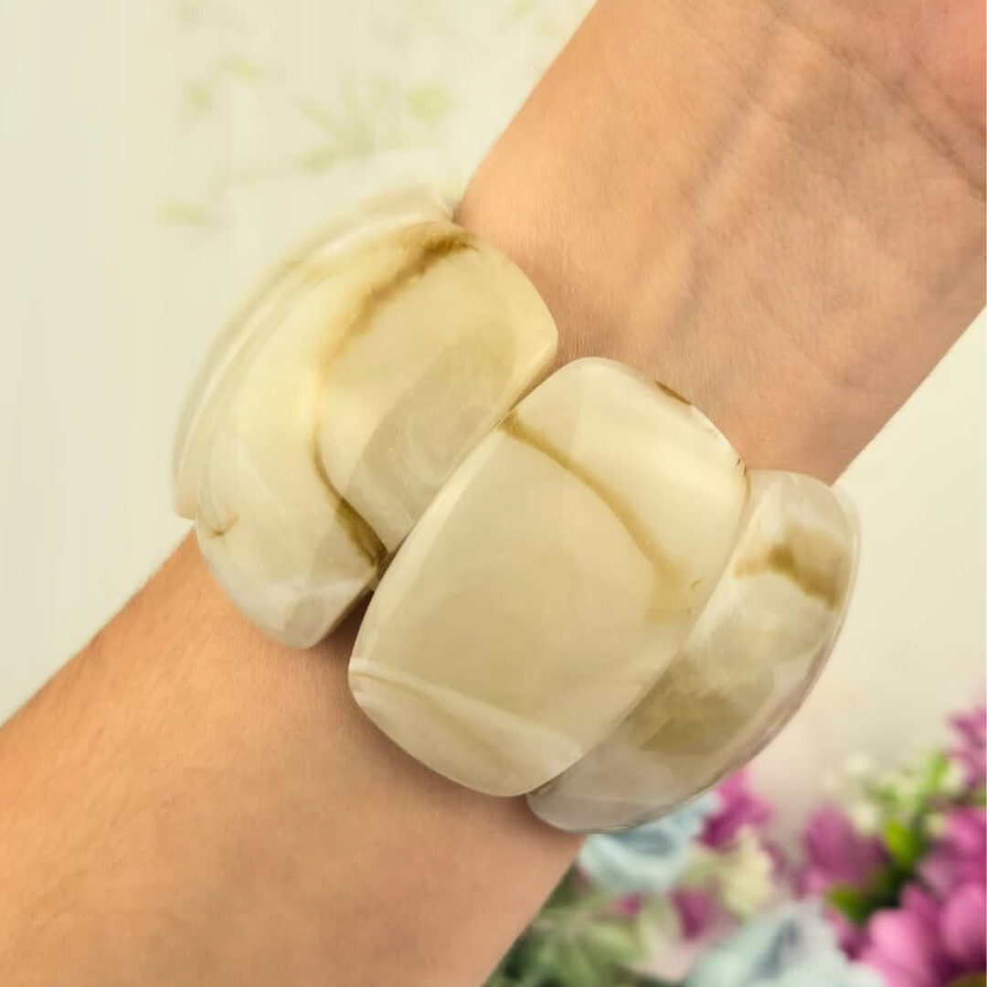 Este pulso destaca por su diseño moderno y elegante con piezas ovaladas maxi en acrílico marfil, logrando un efecto marmoleado suave y sofisticado. Su estructura elástica permite un ajuste cómodo y fácil de colocar, haciendo de esta pieza una opción ideal para quienes buscan estilo y comodidad en un solo accesorio.