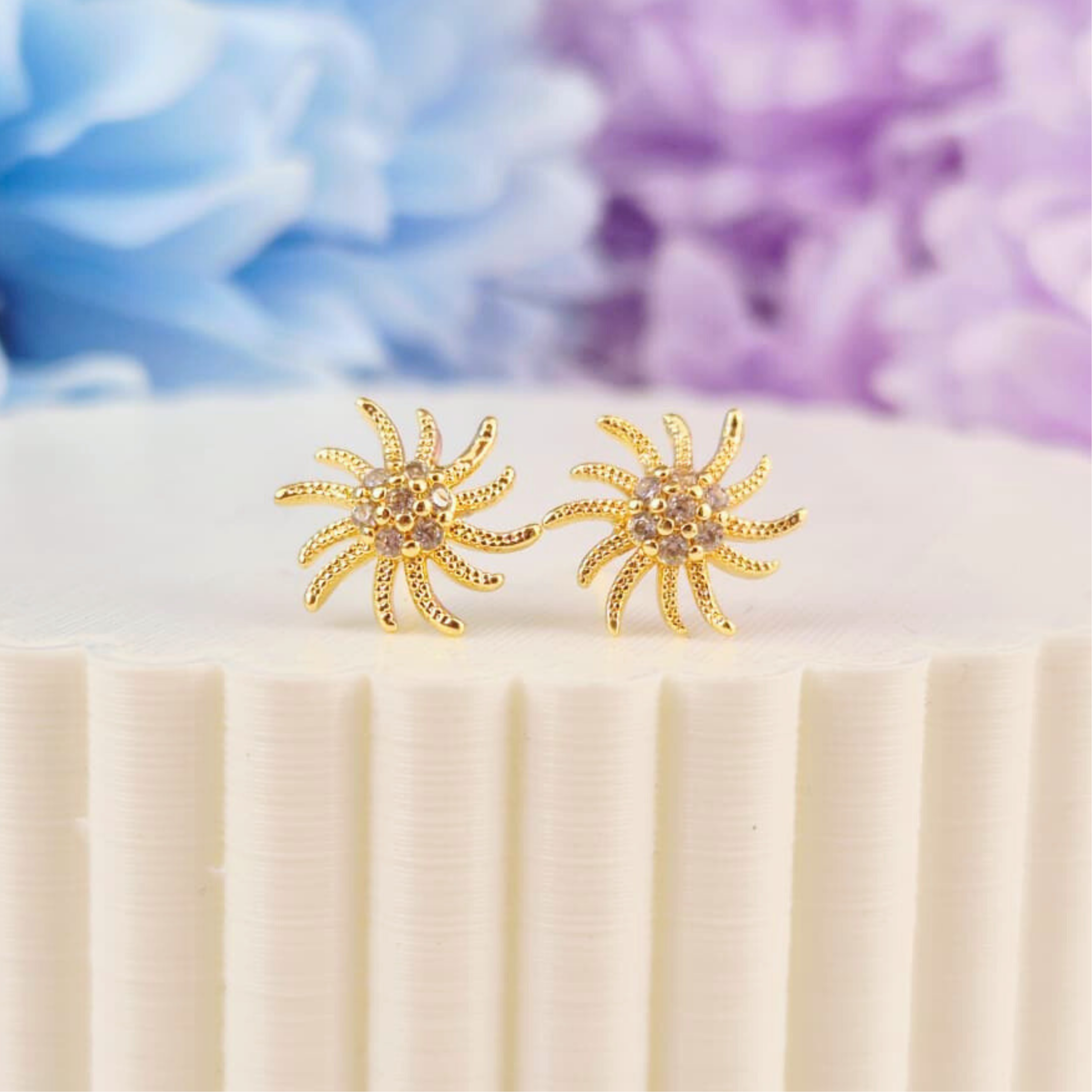 Aretes con diseño inspirado en el sol, decorados con delicados rayos dorados que rodean un centro de cristales brillantes que aportan un toque de luz y elegancia.